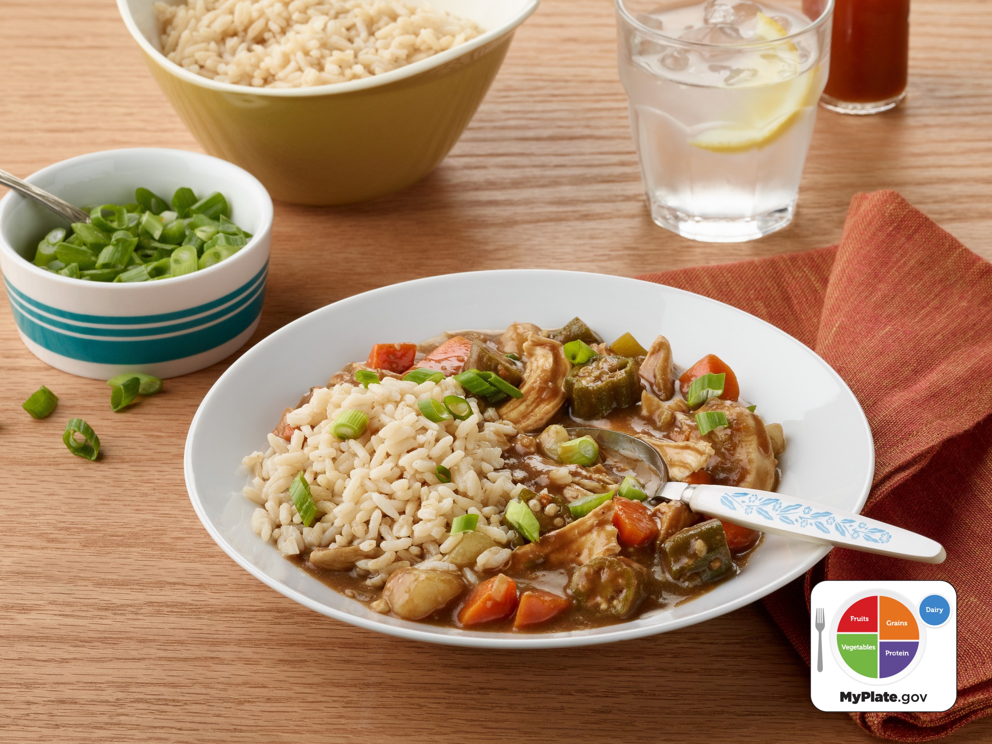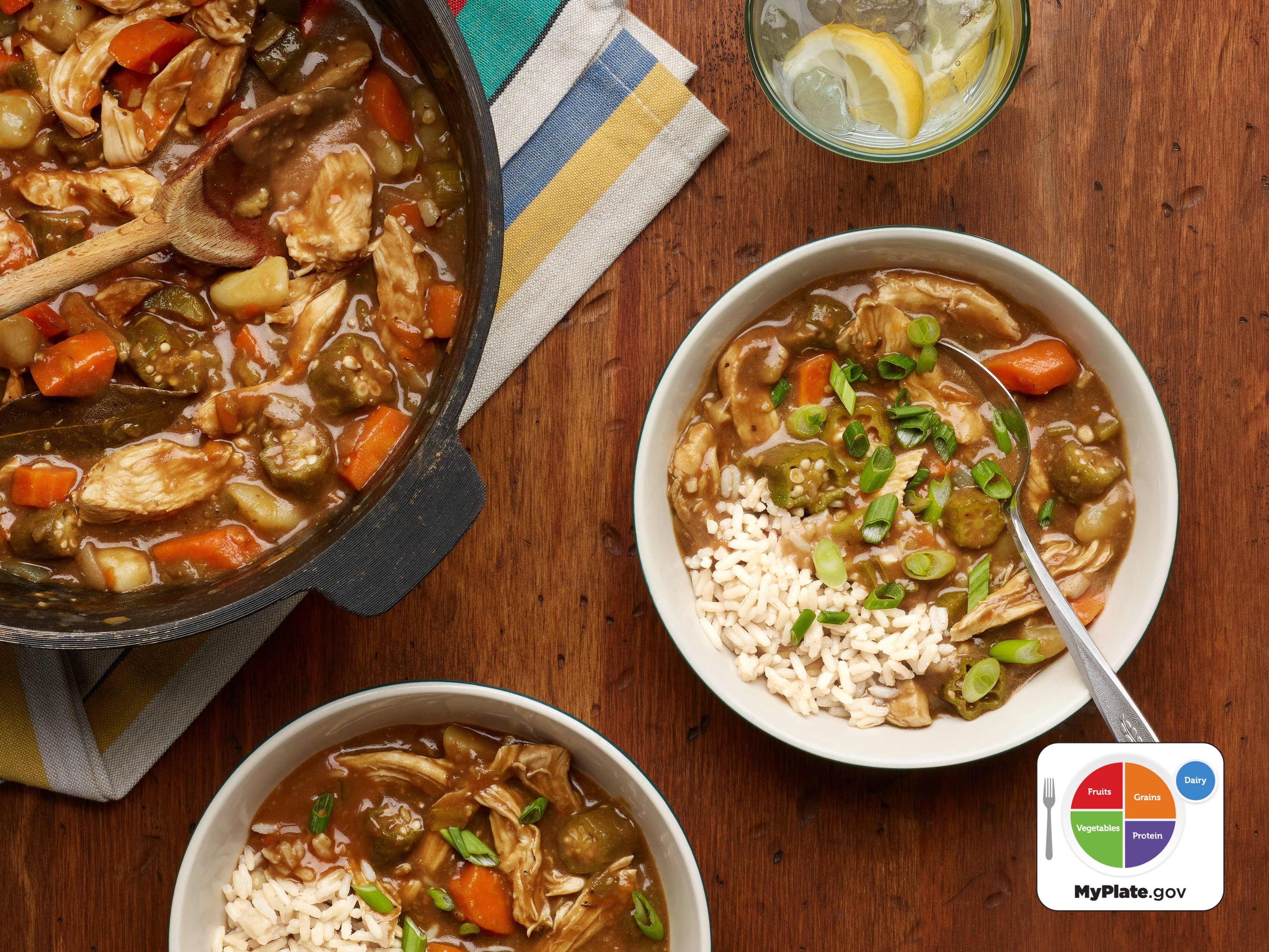 Chicken Gumbo is a stew usually associated with Gulf Coast states, especially Louisiana, that is made with a roux. A small bowl can be served as a starter, while a larger serving stands as a main dish.